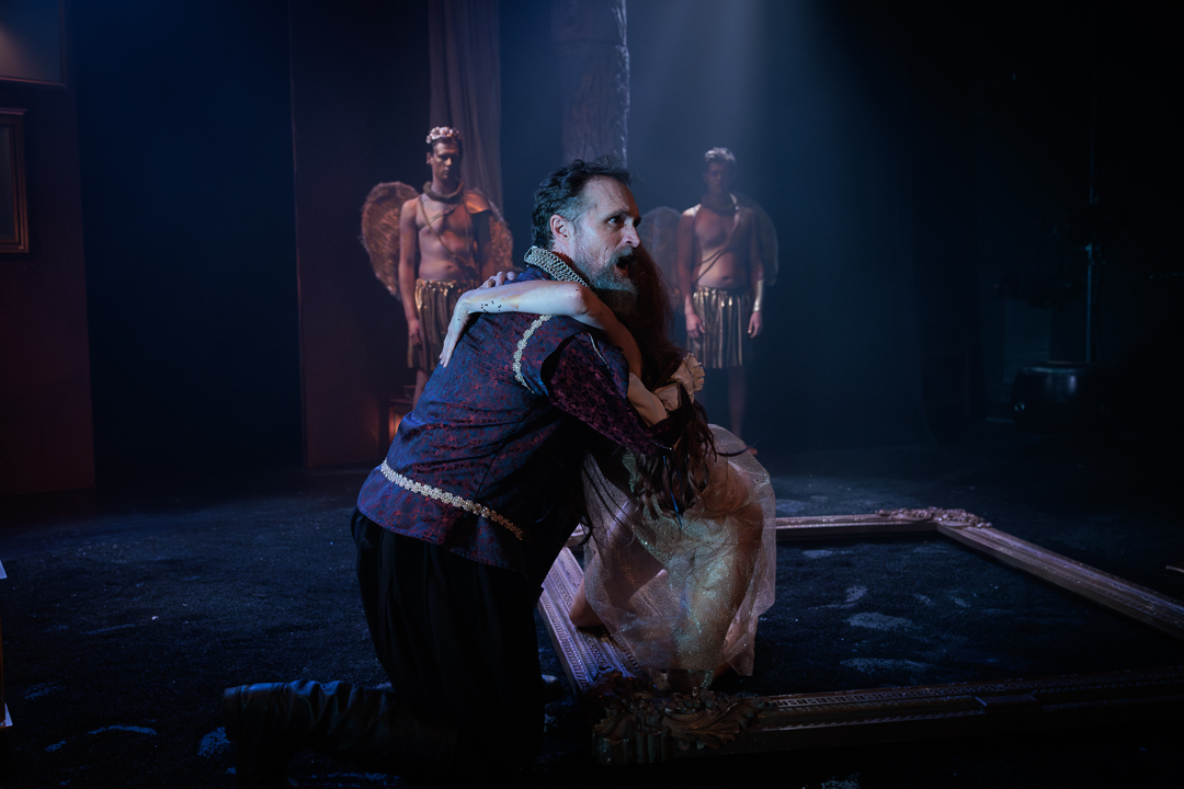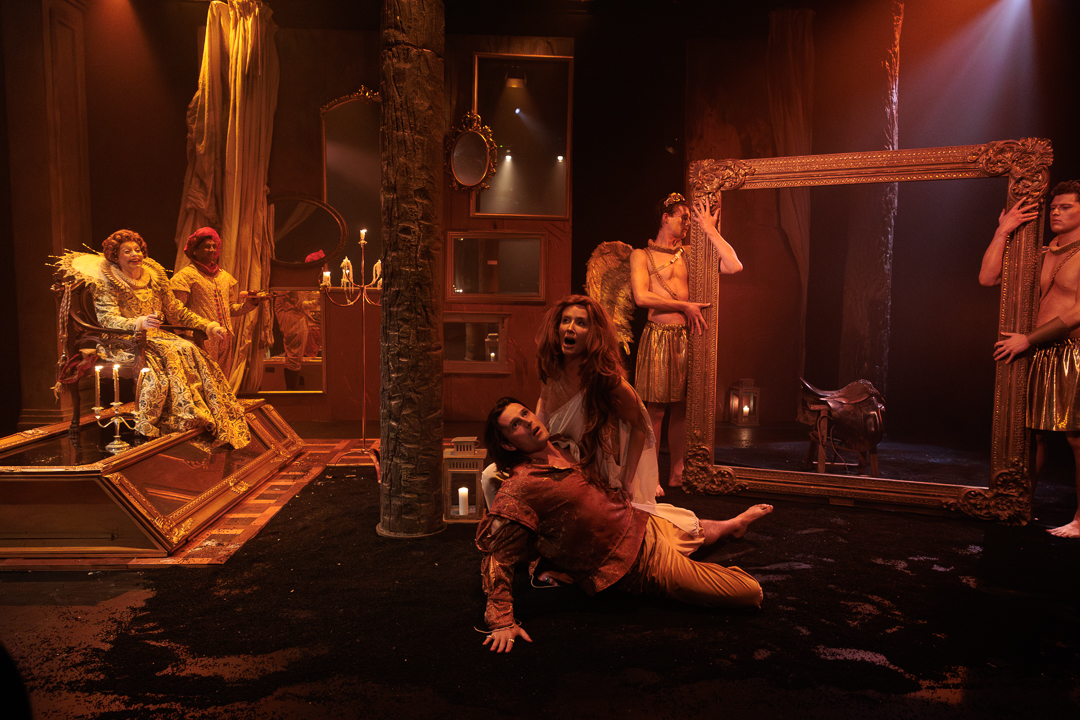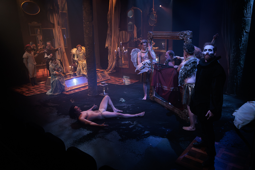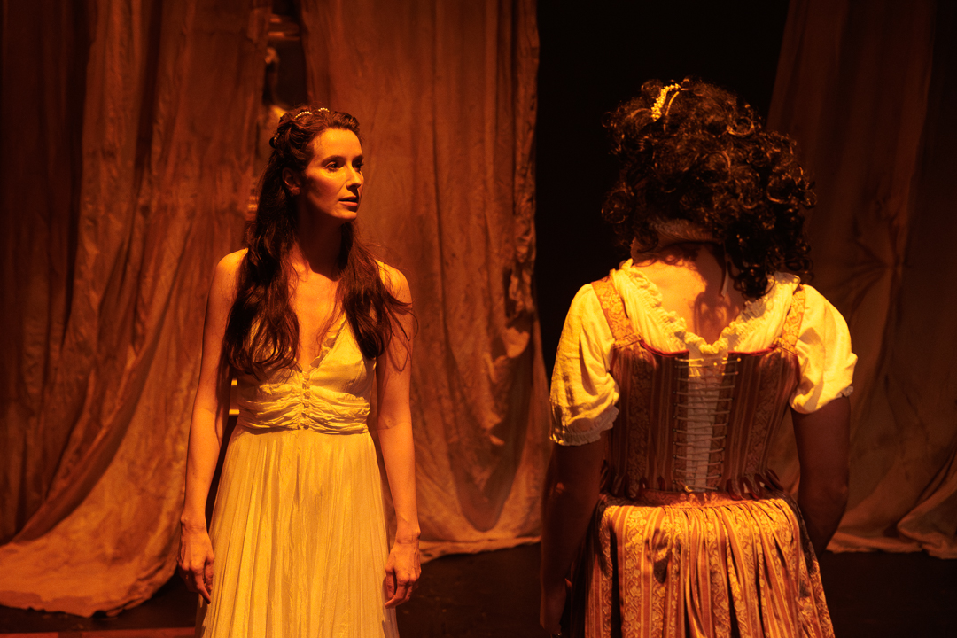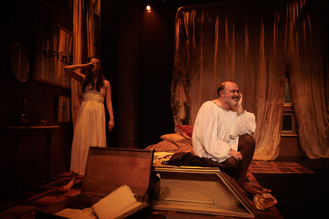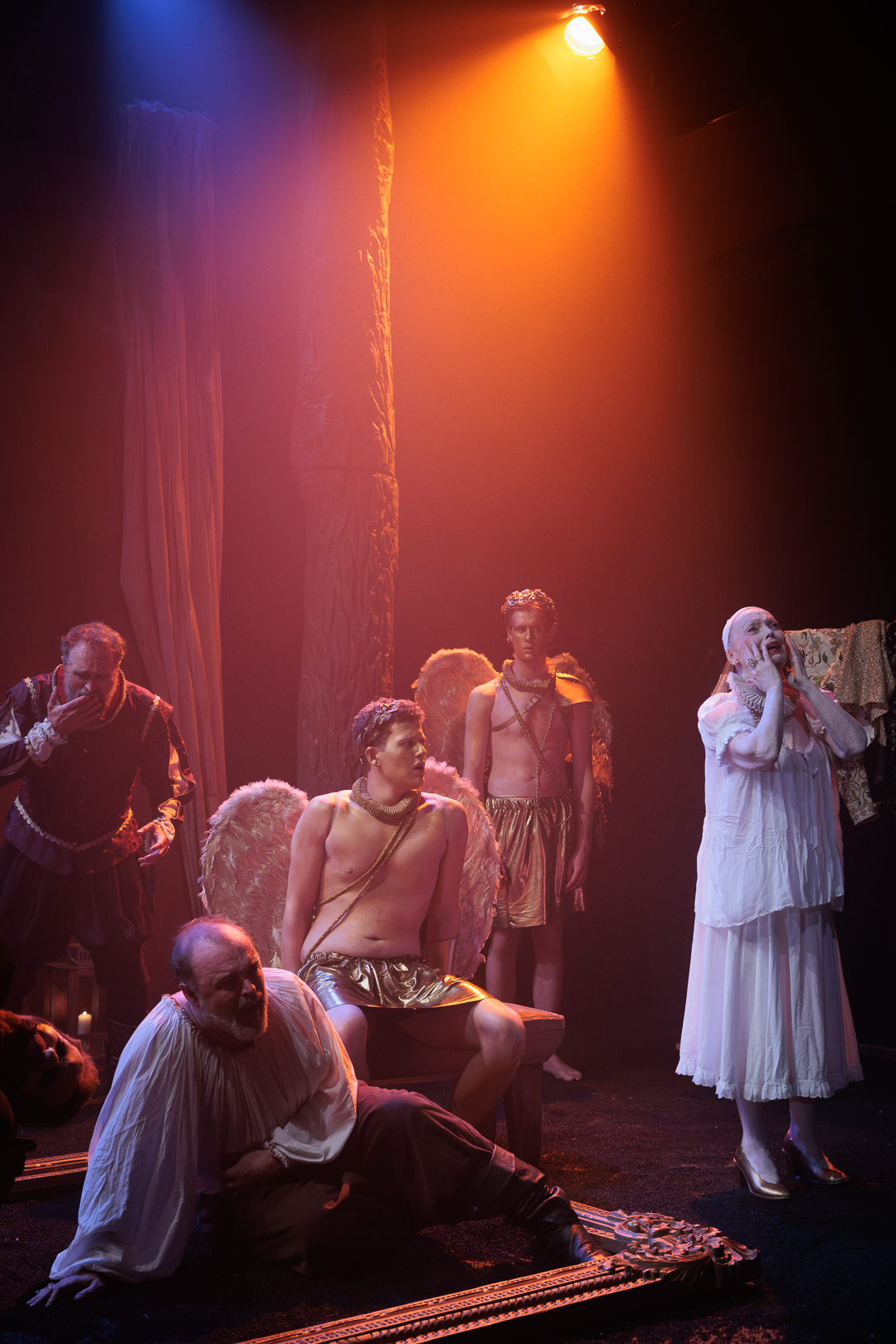Lighting designer Sophie Parker achieves the same … luscious, visual feast … on stage in the Reginald’s black box: it’s chiaroscuro-au-go-go and utterly ravishing. A mix of firelight, candles, and subtly placed lamps burnishes naked flesh, glitters off earrings, flashes off finger rings, and gleams off velvet and sweat.