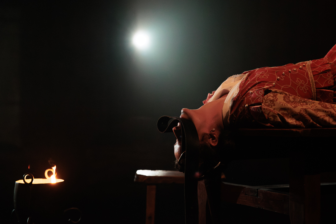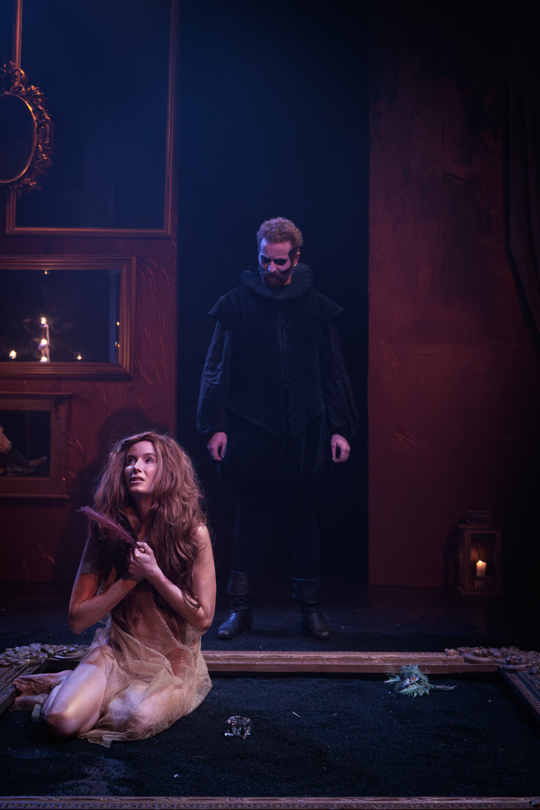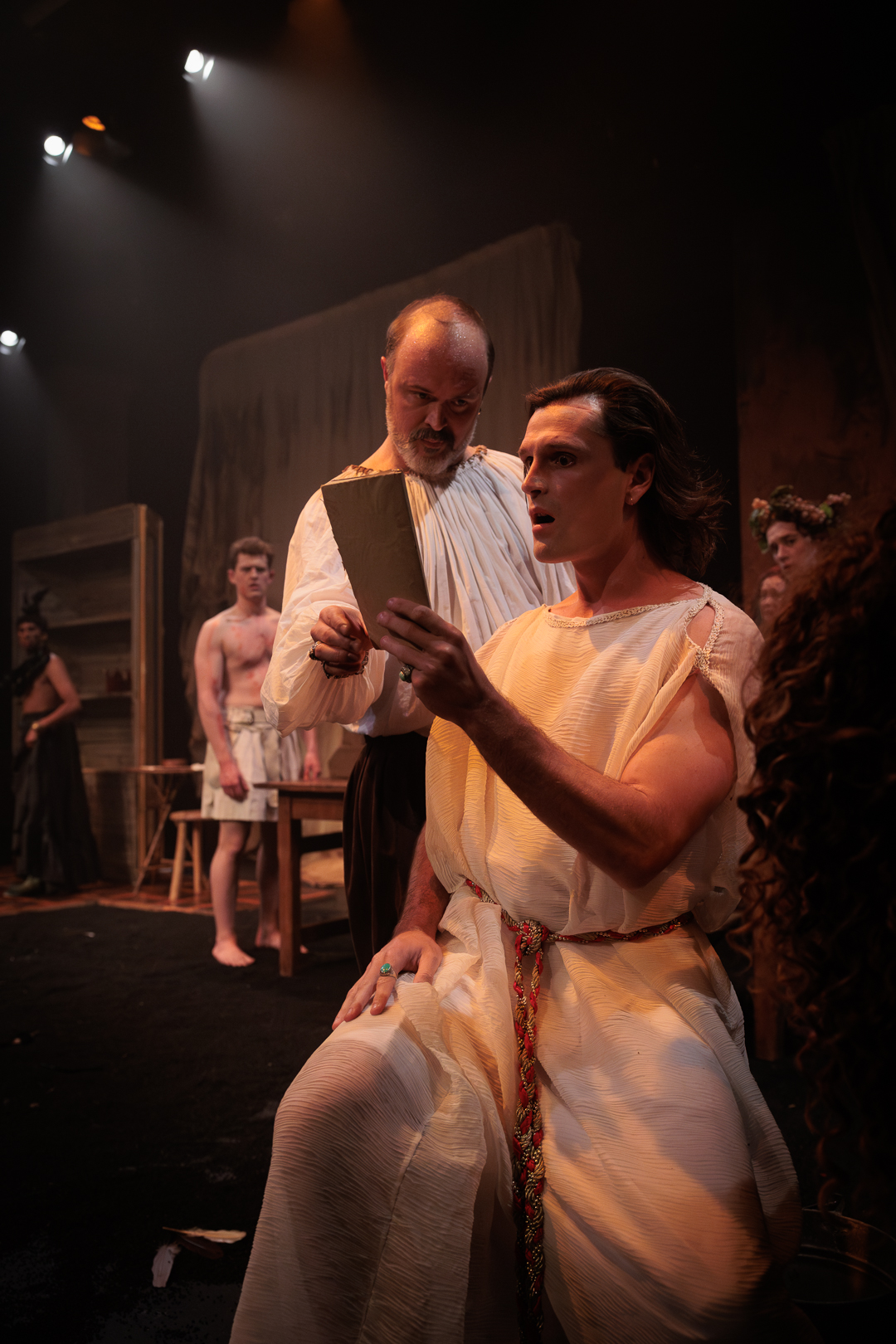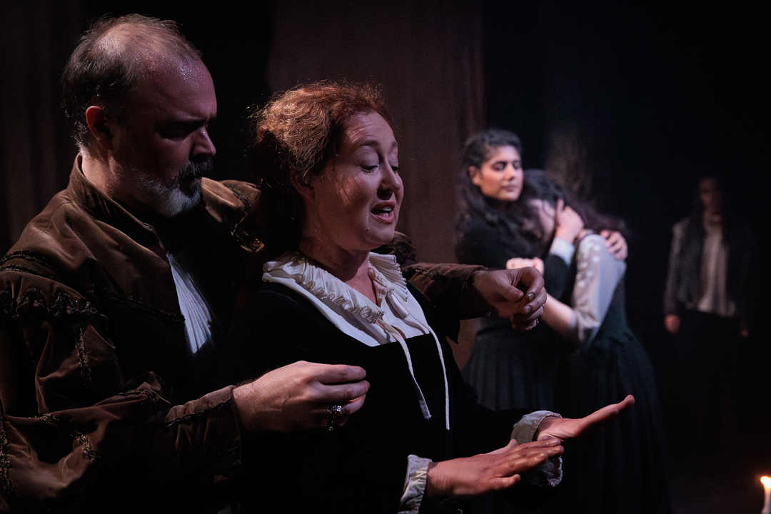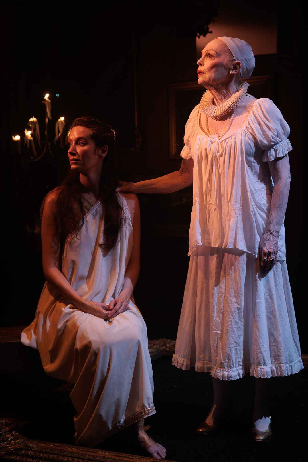 Lighting designer Sophie Parker achieves the same … luscious, visual feast … on stage in the Reginald’s black box: it’s chiaroscuro-au-go-go and utterly ravishing. A mix of firelight, candles, and subtly placed lamps burnishes naked flesh, glitters off earrings, flashes off finger rings, and gleams off velvet and sweat.