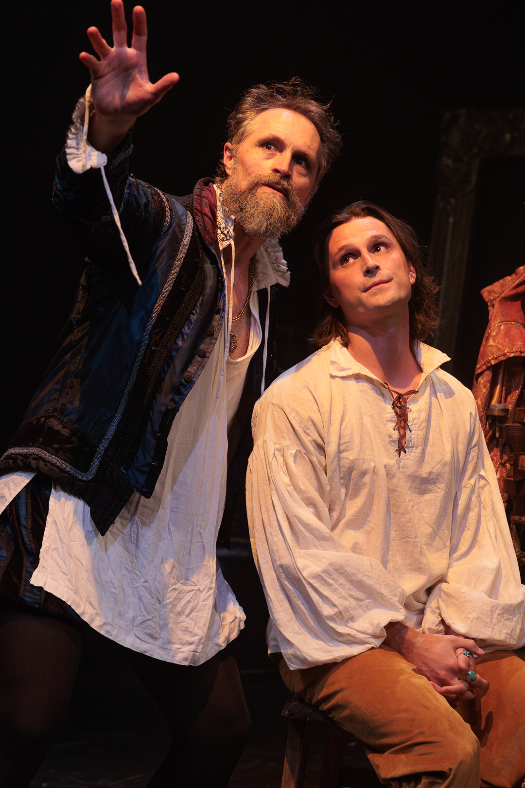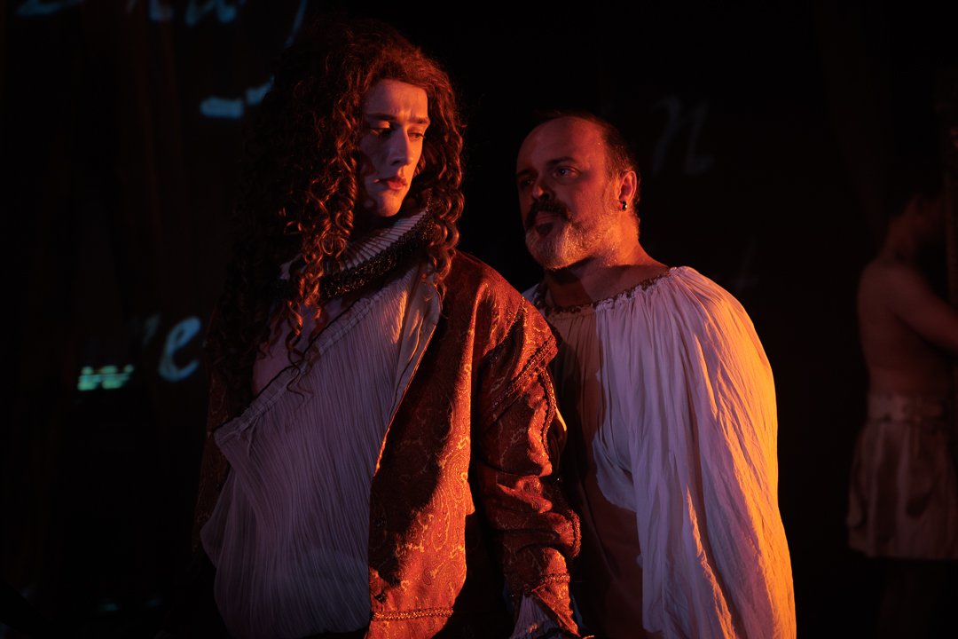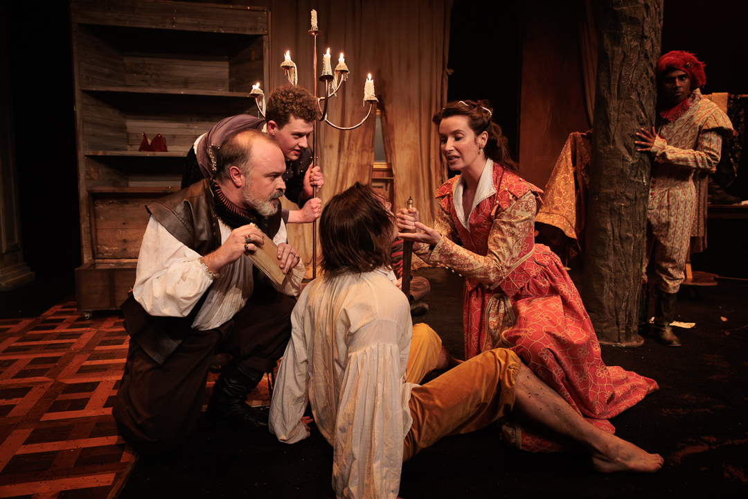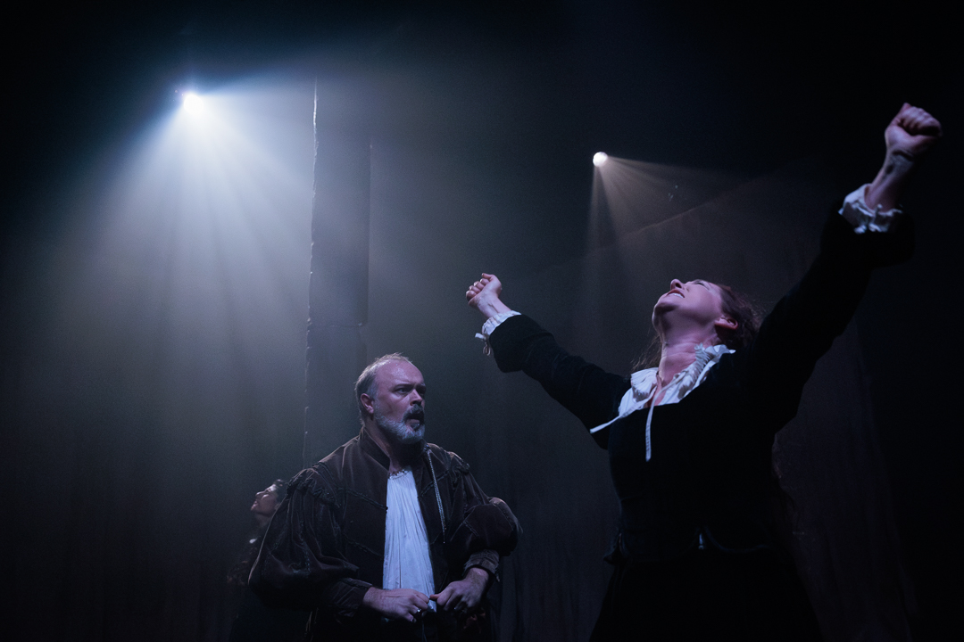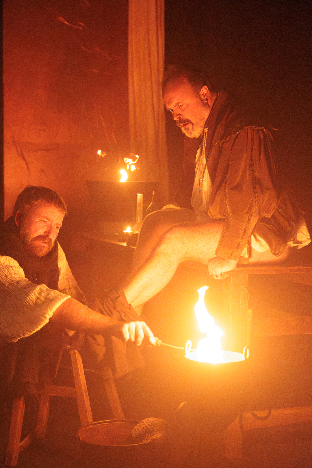 Lighting designer Sophie Parker achieves the same … luscious, visual feast … on stage in the Reginald’s black box: it’s chiaroscuro-au-go-go and utterly ravishing. A mix of firelight, candles, and subtly placed lamps burnishes naked flesh, glitters off earrings, flashes off finger rings, and gleams off velvet and sweat.