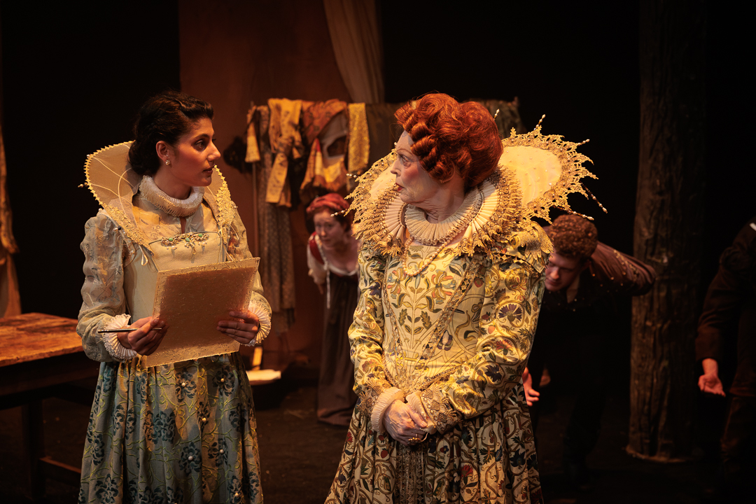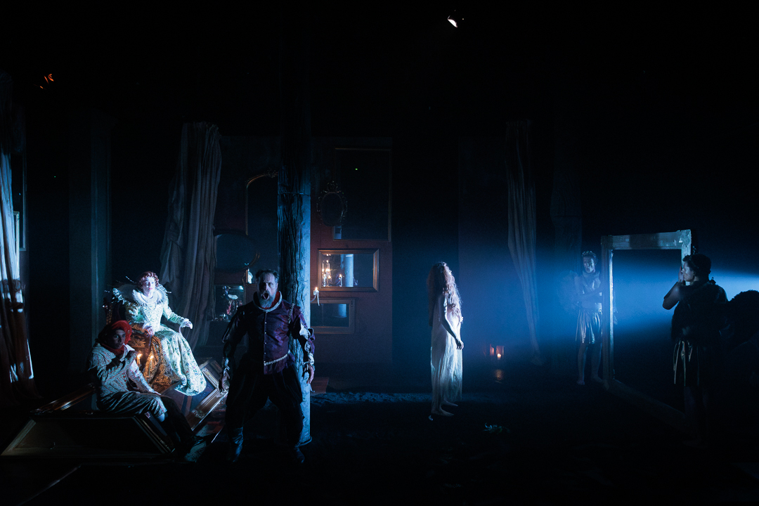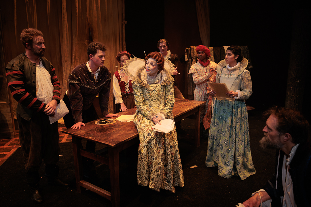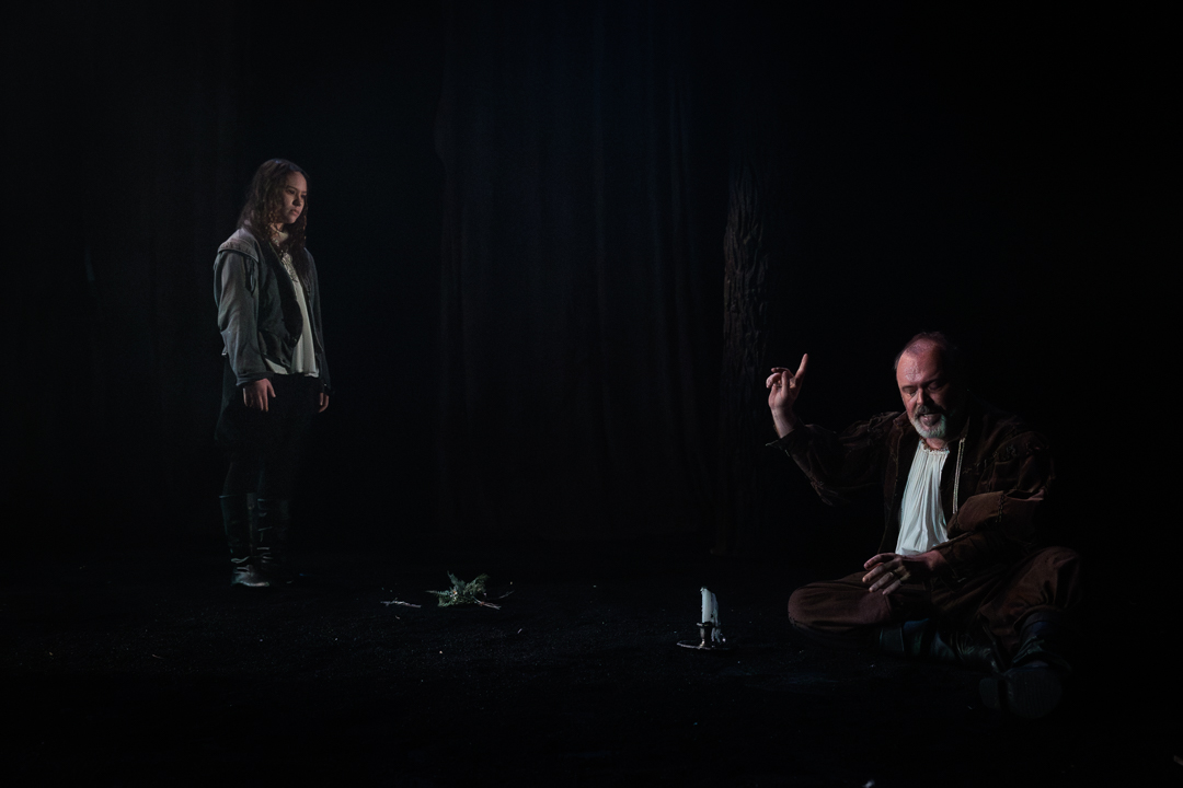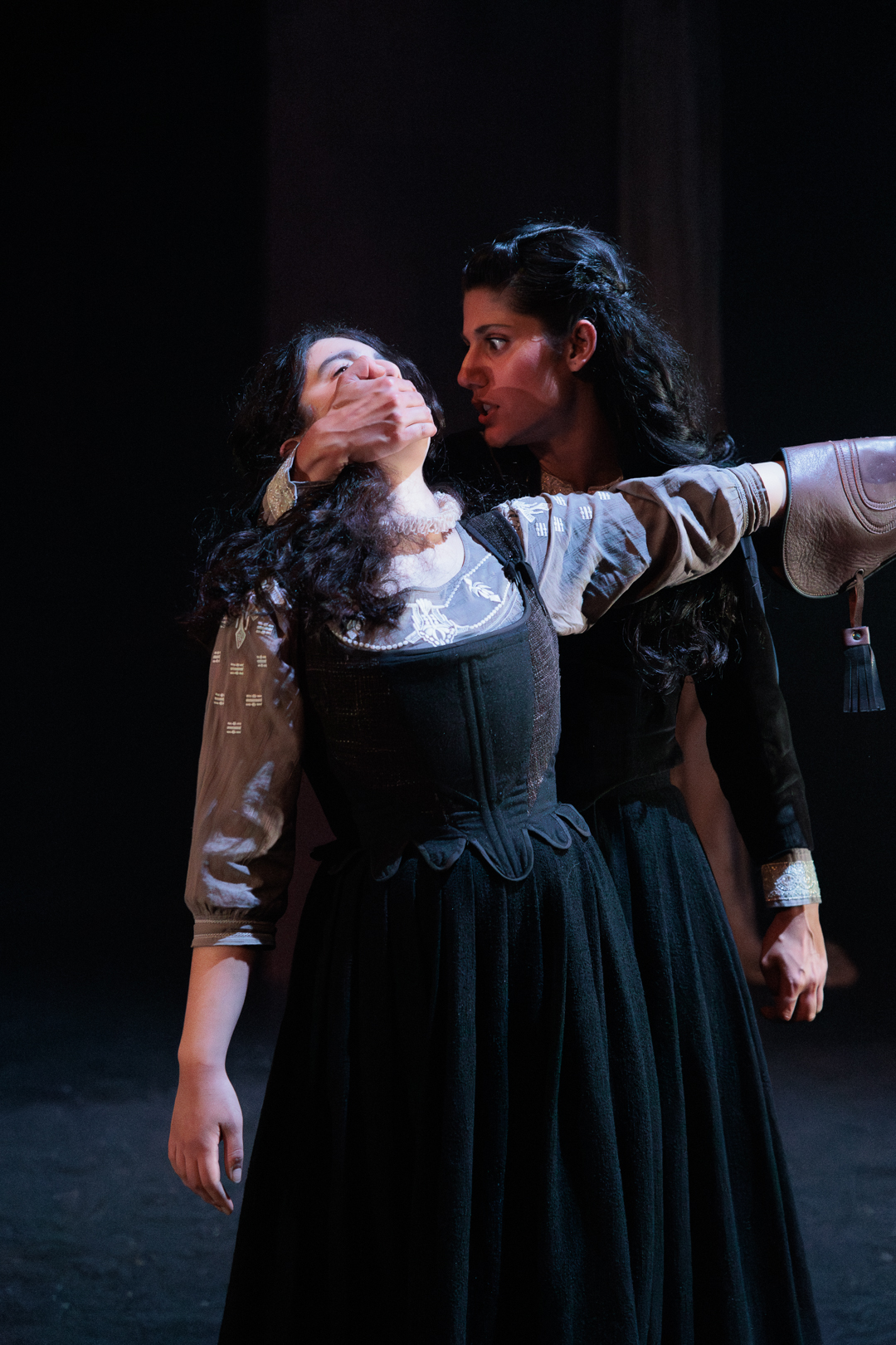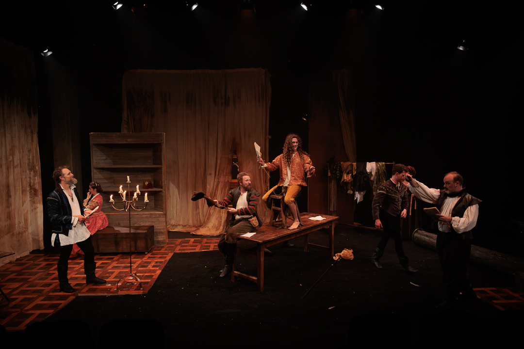 Lighting designer Sophie Parker achieves the same … luscious, visual feast … on stage in the Reginald’s black box: it’s chiaroscuro-au-go-go and utterly ravishing. A mix of firelight, candles, and subtly placed lamps burnishes naked flesh, glitters off earrings, flashes off finger rings, and gleams off velvet and sweat.